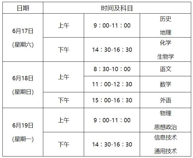 我市2022-2023学年度第二学期普通高中学业水平合格性考试将于6月17日-19日进行。具体考试安排如下: