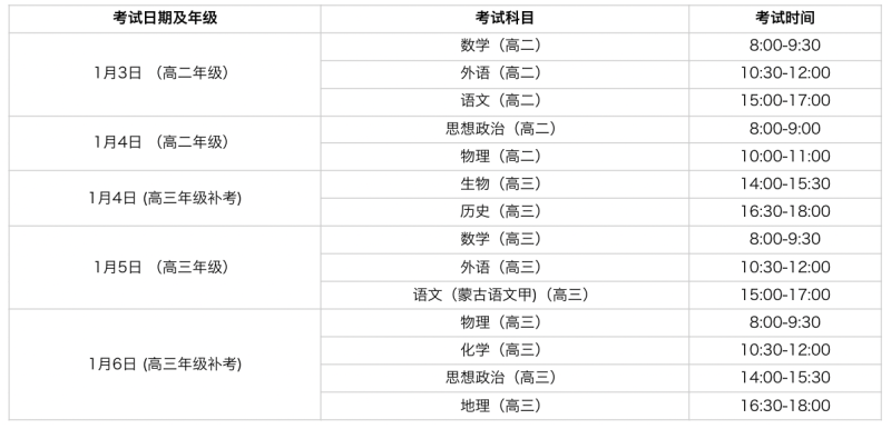 (注意:1.高二年级和高三年级相同名称的考试科目由于科目时长和成绩呈现方式不一致,无法同时开考,须分别在新(高二)旧(高三)两个报名系统各自单独报考,同时进行;2.补考科目只有个别学生考,不是所有学生都考,只有零星考场;3.各科目考试时长和开考以及结束时间节点不一致,其中1月3日、5日正考下午开考时间为15:00, 结束时间为17:00;1月4日、6日补考下午开考时间为14:00,结束时间为18:00。)