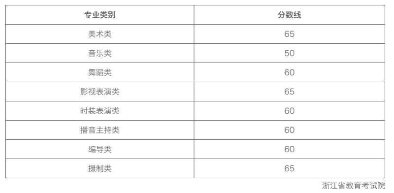 据悉浙江省2022年普通高校招生艺术类专业省统考合格分数线已公布,考生可登录浙江省教育考试院网站(网址:https://www.zjzs.net) 查询成绩。考动力小编了解到2022年艺术类各专业的合格分数线如下: