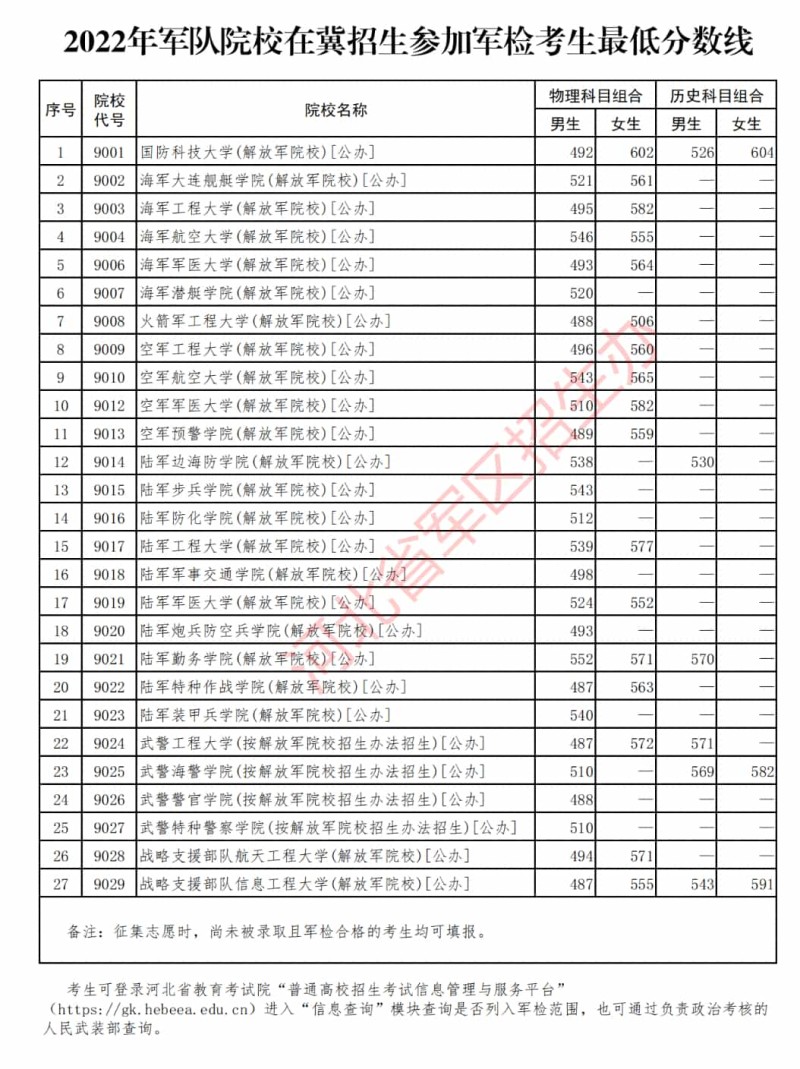 2022年军队院校在冀招生参加军检考生最低分数线已经发布,考生可登录河北省教育考试院“普通高校招生考试信息管理与服务平台”(https://gk.hebeea.edu.cn)进入“信息查询”模块查询是否列入军检范围,也可通过负责政治考核的人民武装部查询。